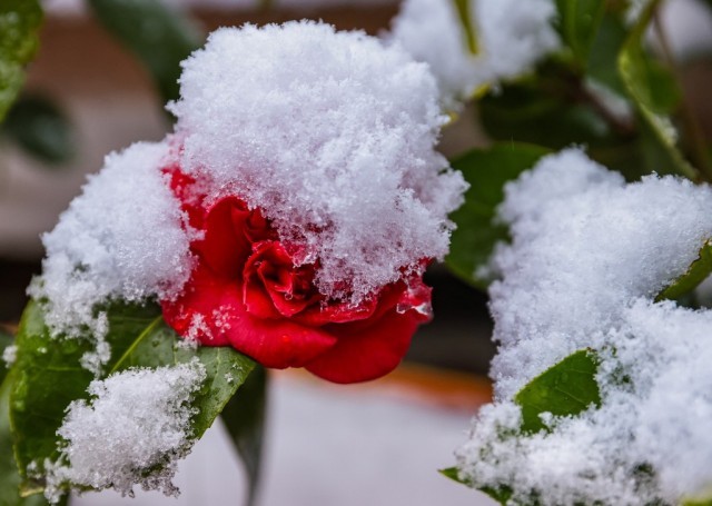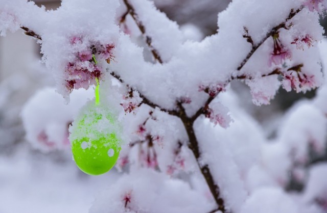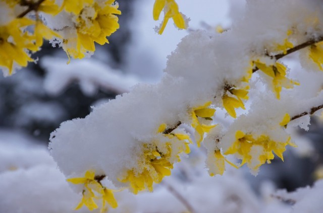 当地时间2022年3月31日,德国石勒苏益格-荷尔斯泰因州,弗伦斯堡下雪,花上落满了白雪。