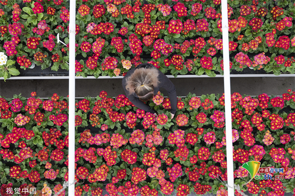 当地时间2023年2月22日,德国萨克森自由州德累斯顿,园丁在温室里检查各种报春花。这些植物是德累斯顿花展的一部分,该花展将于当地时间2023年3月3日至12日在巴洛克宫殿的花园里举行。