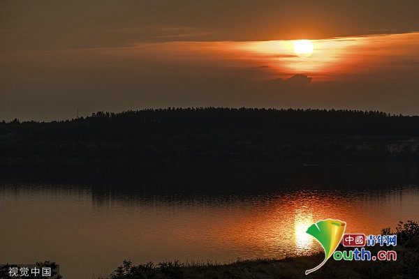 当地时间2023年6月19日,德国勃兰登堡州, Altdoebern湖上的落日风景。预计未来几天,勃兰登堡州南部气温将超过30摄氏度。天气潮湿,可能附有雷暴。