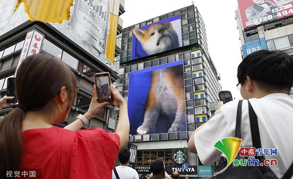 当地时间2023年7月1日,日本大阪道顿堀,一座建筑物的墙上竖起了一个3D广告牌,一只秋田犬从屏幕上伸出来。
