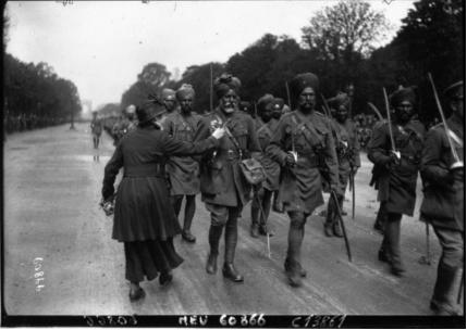 一份是“巴黎人向锡克教教徒献花”照片副本,原片摄于1916年7月14日法国阅兵式上的香榭丽舍大街,原片仍保存在法国国家图书馆。报道说,这张照片描绘的是一名路人向一名印度驻法国锡克教军官献花,向一战期间与法国并肩作战的印度士兵致敬。这张照片拍摄之际,一战中最惨烈的战事索姆河战役已经打响。新德里电视台称,莫迪此次访法期间,7月14日的法国国庆日也有来自印度的士兵参加阅兵式。