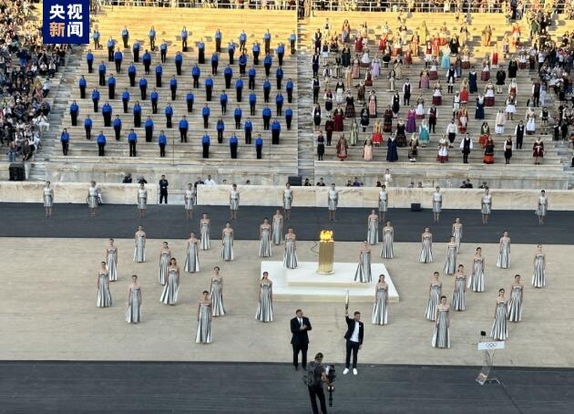 当地时间4月26日,在巴黎奥运会火种交接仪式现场,希腊奥委会主席卡普拉洛斯将火种交给巴黎奥组委主席埃斯坦盖。