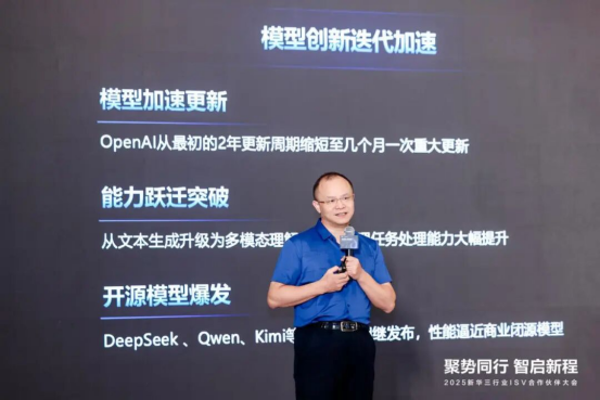 随着 AI 技术向行业深水区渗透,智能体成为场景落地的关键抓手。新华三集团数字中国研究院执行副院长岳鹏聚焦这一前沿方向,围绕“躬耕百业,灵犀一点——在智能体爆发前夜的思考”主题展开分享。他谈到,AI领域呈现大语言模型触顶、世界模型崛起的新态势,通用大模型落地存短板。新华三构建“数据 - 模型 - 应用”全栈体系,通过小模型适配、智能体编排等在招投标监管、基层治理、干部管理等场景实现突破,打造标准化工程交付体系。期待与行业伙伴深化协作,以“智能体建设五部曲”为指引,共同攻克技术难点,推动智能体在百业落地生根,共迎智能时代新机遇。