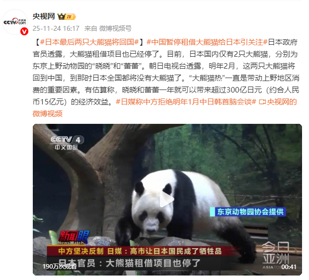 日本政府官员透露,大熊猫租借项目也已经停了。目前,日本国内仅有2只大熊猫,分别为东京上野动物园的“晓晓”和“蕾蕾”。朝日电视台透露,明年2月,这两只大熊猫将回到中国,到那时日本全国都将没有大熊猫了。“大熊猫热”一直是带动上野地区消费的重要因素。有估算称,晓晓和蕾蕾一年就可以带来超过300亿日元(约合人民币15亿元)的经济效益。
