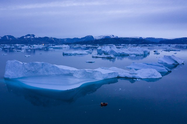 当地时间2019年8月15日,格陵兰东部,一艘船在夜晚航行在巨大的冰山旁边。