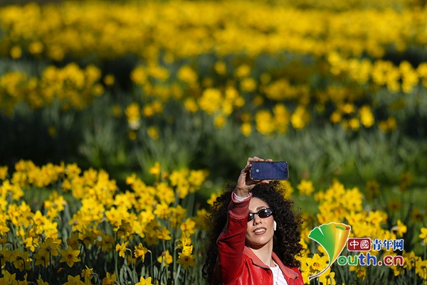 当地时间2026年3月2日,英国伦敦,一名女子在圣詹姆斯公园的水仙花丛中自拍。