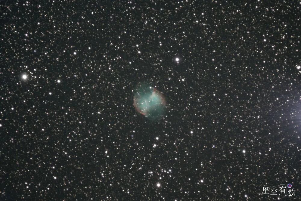 2025年4月1日晚,在河北省承德市兴隆县拍摄的“梅西耶天体”中的M27——哑铃星云。(刘仲利 摄)