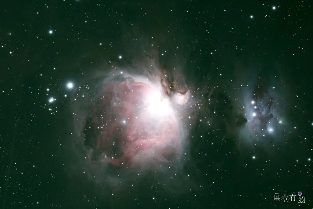 2025年4月1日晚,在河北省承德市兴隆县拍摄的“梅西耶天体”中的M42——猎户座大星云。(刘仲利 摄)