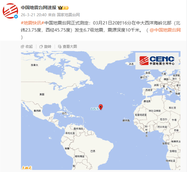 中国地震台网正式测定:03月21日20时16分在中大西洋海岭北部(北纬23.75度,西经45.75度)发生6.7级地震,震源深度10千米。