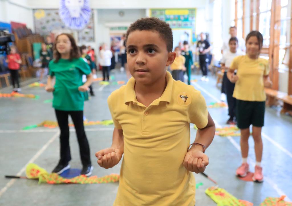 2023年10月2日,英国伦敦弗洛拉花园小学学生跟随来自中国的体育教师学习武术动作。新华社记者李颖摄