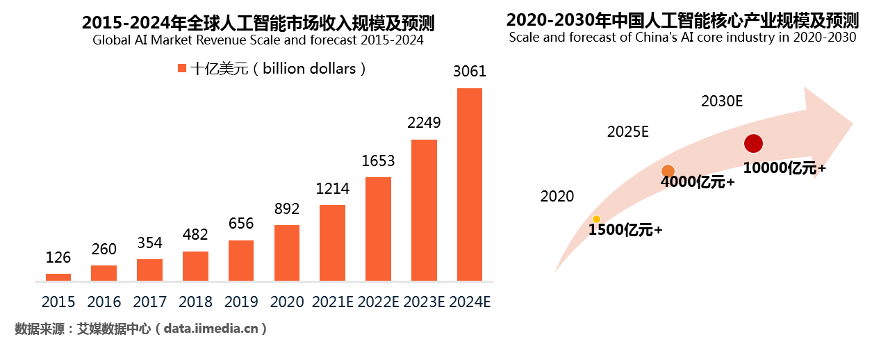 国家“十四五”规划纲要提出要推动人工智能与实体经济融合、完善人工智能发展环境、构建产业发展新生态,尽力改善目前我国人工智能在基础科研、基础算法、核心芯片、高端人才等方面的短板问题,为未来人工智能营造良好的发展环境、注入新动能。2021年作为“十四五”规划的开局之年,数字产业化和产业数字化协同发展成为报告的两大亮点,均显示出数字经济发展的必要性和重要性。