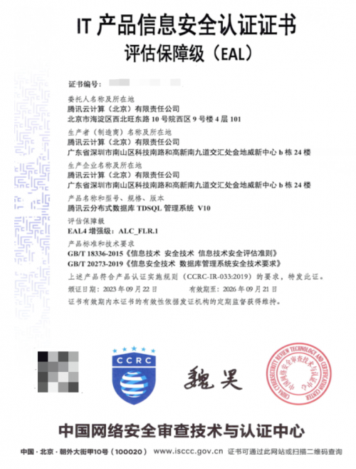 EAL评估保障等级认证评估要求严格,除了产品安全逻辑要求严格,更需要对参评单位的产品生命周期管理进行评估,同时也会通过严格的渗透测试检测产品安全性。经过中电十五所、CCRC专家团队近一年的专业评估、安全测试,腾讯云TDSQL凭借过硬的产品安全功能、全面的安全保障和完备的产品安全设计及演进思路,一次性取得了最高评估保障级EAL4级认证,这代表TDSQL行业领先的数据安全保障能力得到了官方权威机构认可。