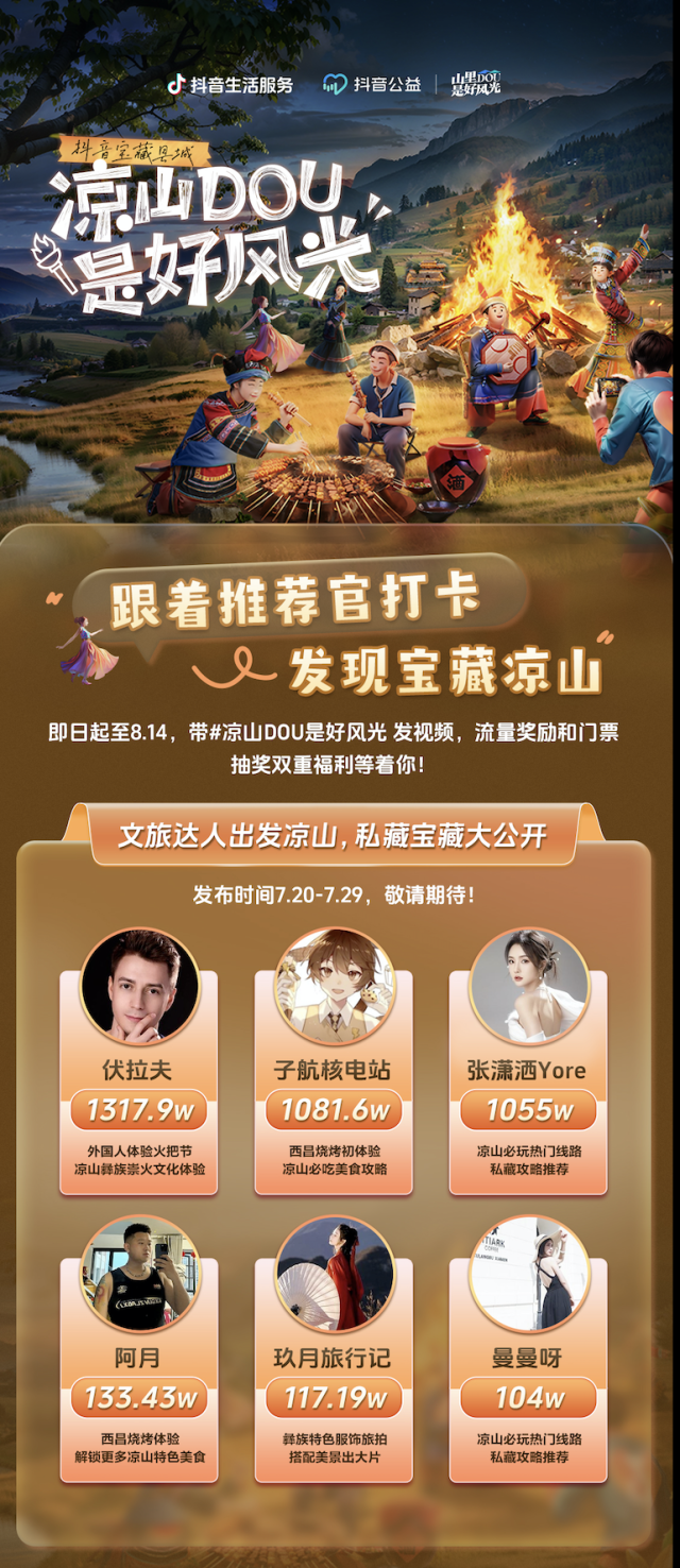 公开资料显示,“山里DOU是好风光”项目由抖音公益和抖音生活服务联合发起。2023年,项目助力超2万个乡村文旅经营主体增收,吸引乡村游客约1990万人次。在文化和旅游部资源开发司的指导下,项目开展“美好乡村等你来”乡村旅游数字提升行动,通过“县域特色文旅活动助力”“乡村旅游重点村镇帮扶”“乡村文旅创作者扶持”三大专项行动,加强乡村内容传播,助力乡村文旅数字化升级。据悉,凉山是“县域特色文旅活动助力专项行动”的重要一站。