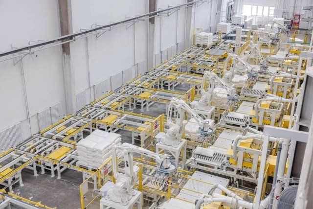 仓储环节中,智能立体仓库是仓储周转核心枢纽,12层高自动化立库库容 1.2万吨,自动堆垛机、自动翻垛机等自动化设备及智能化系统与WMS系统协同运作,系统智能分配货位、堆垛机自动存取,实现库存实时更新与账实同步,大幅提升仓储效率,满足规模化存储与灵活调配需求。